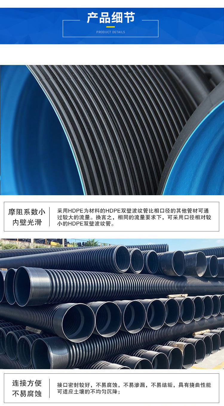 在連接方面,該管材可以通過(guò)膠圈承插的方式連接,具有密封性好、連接可靠、施工方便等特點(diǎn)。同時(shí),HDPE排水波紋管還具有較好的耐酸、耐堿、耐腐蝕等化學(xué)性能,能夠適應(yīng)不同的排水環(huán)境。