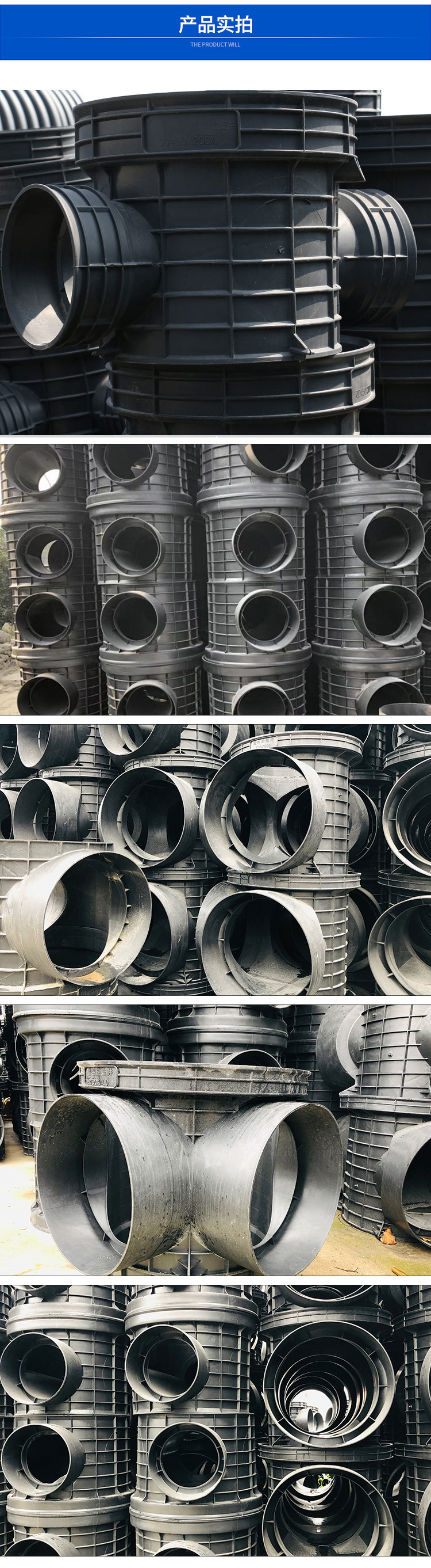 塑料檢查井又稱排水井,一般設(shè)在排水管道交匯處轉(zhuǎn)彎處、管徑或坡度改變處、跌水處以及直線管道上每隔一定距離處,是便于定期檢查、清潔和疏通管道的排水附屬構(gòu)筑物。塑料檢查井以高分子樹脂為原料,采用組合結(jié)構(gòu),通常由井底座、井筒、井蓋、蓋座和混凝土支承板等組成。其中關(guān)鍵的井座部分采用一次性成型,可制造二通,三通,四通90°-165°任意交匯的所有規(guī)格檢查井,以變徑接頭、可變角接頭及密封圈等配件來達到改變管徑及角度的連接。井筒采用PE管材、波紋管或纏繞管調(diào)整井筒,可根據(jù)現(xiàn)場埋設(shè)深度截取相應(yīng)長度,具有很大的靈活性。井筒、進(出)水管道與井座的連接采用橡膠密封圈柔性連接,可適應(yīng)小范圍的內(nèi)角度變化,施工方便快捷,密封性能好、永不滲漏,環(huán)保節(jié)能。